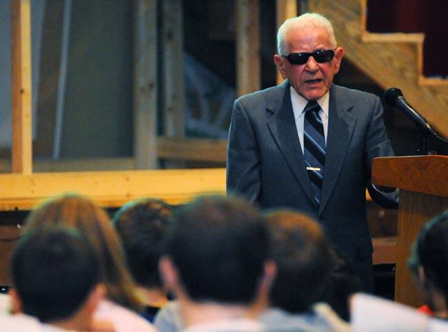 Max Edelman, 87, speaks to a group of eighth-grade students